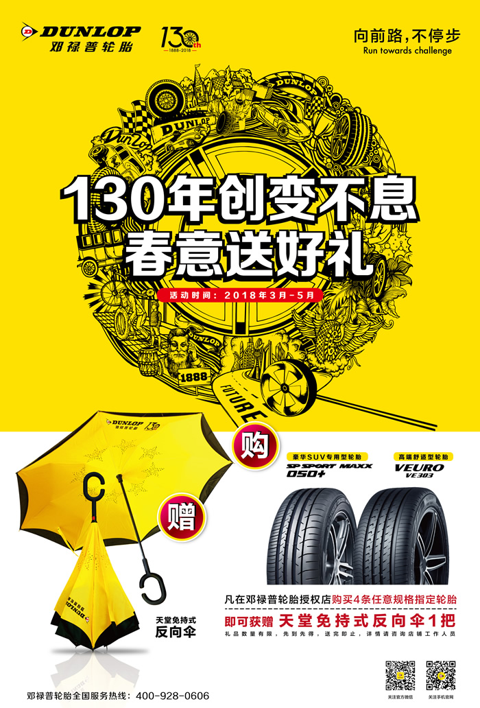 值此130周年慶典之際,為了回饋廣大車主對(duì)鄧祿普的厚愛與支持,鄧祿普將在全國(guó)范圍內(nèi)推出“春意送好禮”促銷活動(dòng):2018年3月至5月,消費(fèi)者前往鄧祿普指定門店購(gòu)買4條SP SPORT MAXX 050+或VEURO VE303輪胎,即可獲贈(zèng)印有紀(jì)念LOGO的定制版天堂免持式反向傘,無(wú)論風(fēng)雨,鄧祿普都將與車主一路相伴。